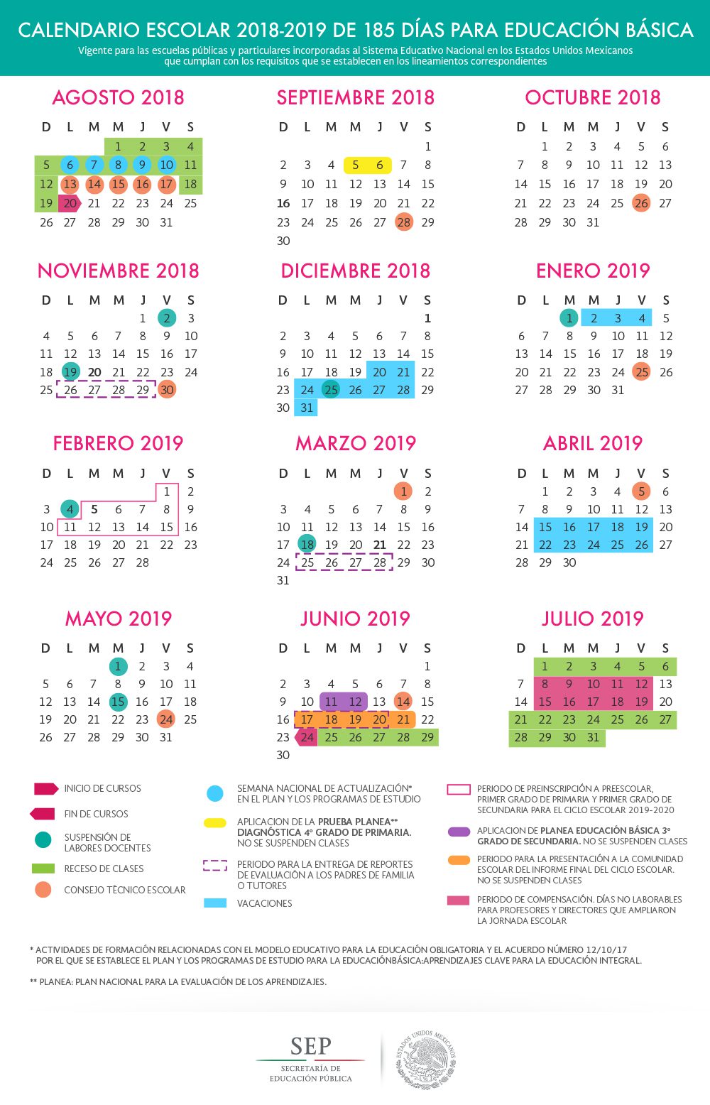 Calendario escolar 2018 – 2019 de 185 días para la Educación Básica, está vigente para escuelas públicas y particulares incorporadas al Sistema Educativo Nacional; inicia el próximo 20 de agosto y concluye el 24 de junio de 2019.