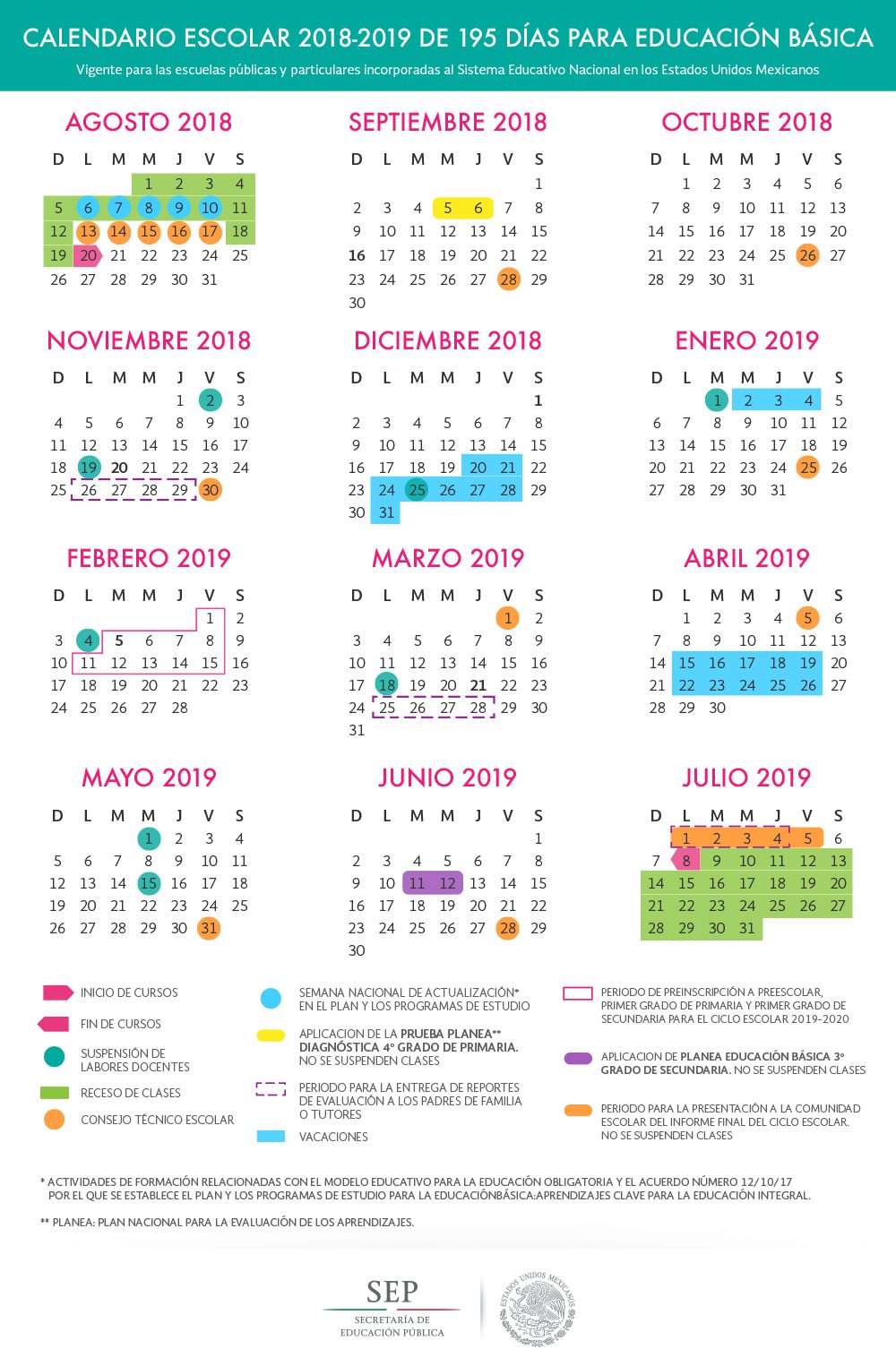 Calendario escolar 2018 – 2019 de 195 días para la Educación Básica, vigente para las escuelas públicas y particulares incorporadas al Sistema Educativo Nacional; comienza el 20 de agosto y termina el 8 de julio del siguiente año.