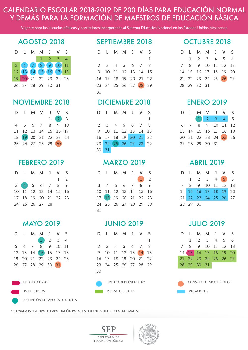 El calendario escolar 2018 – 2019 de 200 días para Educación Normal y demás para la formación de maestros de Educación Básica, está vigente para escuelas públicas y particulares incorporadas al Sistema Educativo Nacional que cumplan con los requisitos que se establezcan en los lineamientos que expide la SEP, mismo que da inicio el 20 de agosto y finaliza el 15 de julio de 2019.